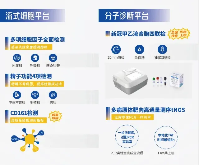 联合医学在分子诊断领域不断探索,借助流式细胞平台、荧光定量PCR平台、高通量测序平台三大诊断平台,研发多款检测试剂及提供解决方案,实现炎症全面检测、男性精子质量评估、结核病辅助诊断,病原体检测及基因检测等。其中即将上市的独家新品:新冠甲乙流合胞四联检,利用PCR技术可进行快速四联检,有效帮助呼吸道疾病的快速检测与精准防控。