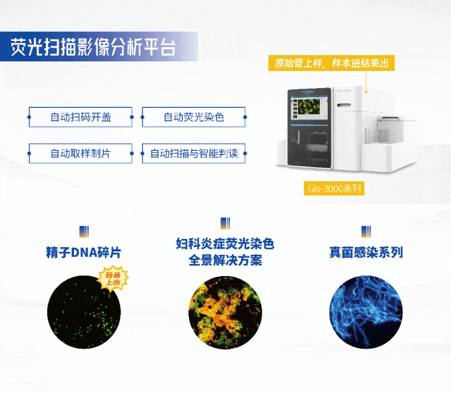 荧光扫描影像分析平台专注于形态学诊断,通过荧光染色技术及AI人工智能阅片可开展妇科阴道炎诊断、真菌感染、精子DNA碎片率检测。其中Gis-3000系列实现阴道炎全自动一体化的高通量检测,彻底解放人工、提升检验效率和实现阴道炎精准诊断。Gis-1000新增精子碎片率检测项目,在显微视野下利用AI阅片技术实现精子DNA碎片的鉴别与统计,提升检测效率,得到更直观准确的结果,满足临床检验需求。