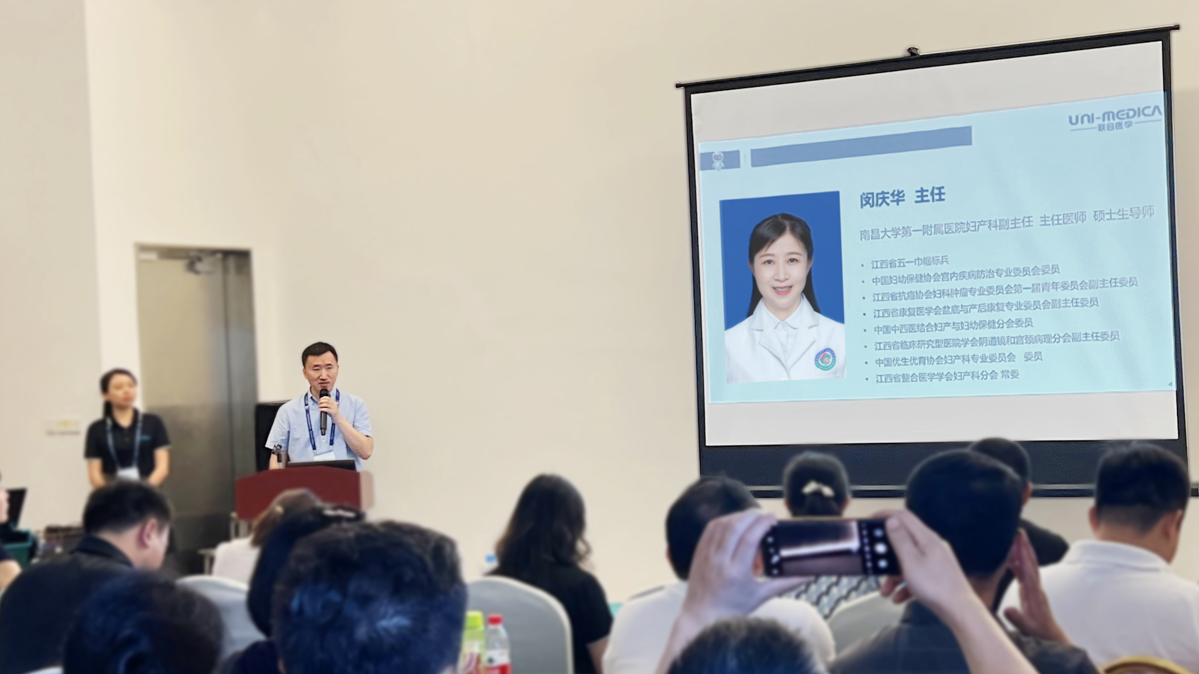 南昌大学第一附属医院妇产科主任闵庆华进行了《全自动荧光染色检测技术在妇科阴道炎中的应用》的主题分享