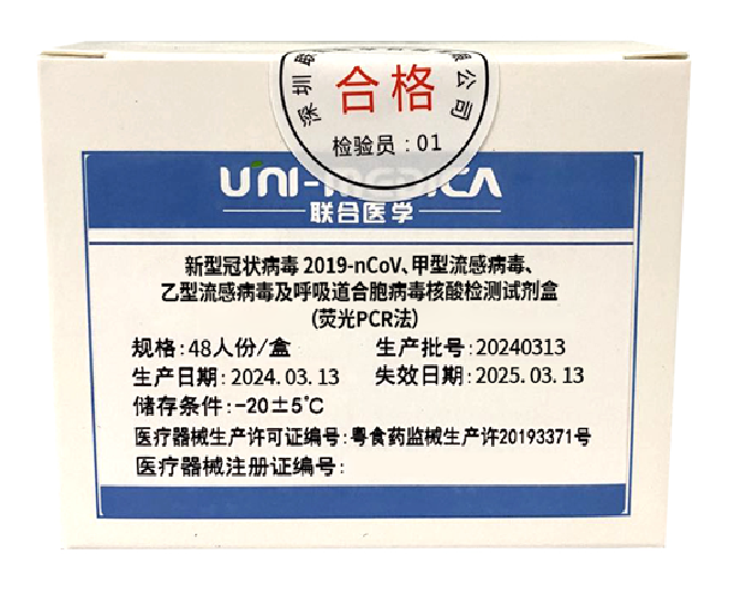 联合医学自主研发的新型冠状病毒(2019-nCoV)、甲型流感病毒、乙型流感病毒及呼吸道合胞病毒核酸检测试剂盒(荧光PCR法)正式获得国家药品监督管理局(NMPA)III类医疗器械注册证(注册证号:国械注准20243401683)。针对上呼吸道感染发病率最高的四种病毒,可在单管内实现快速鉴别诊断。
