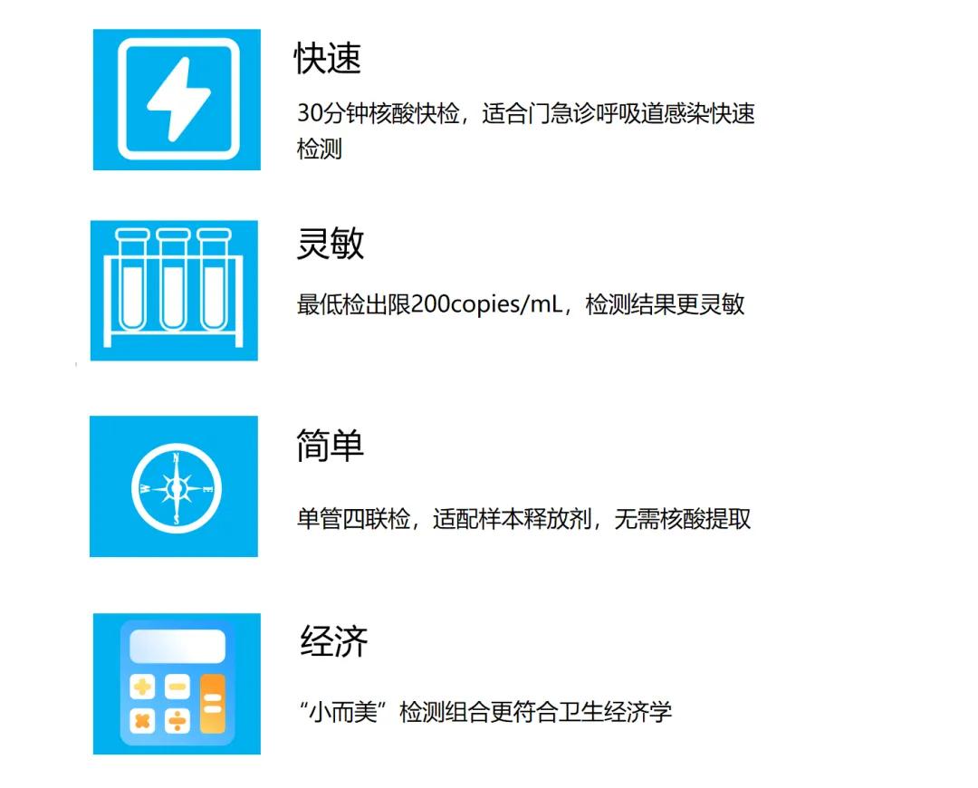 联合医学自主研发的甲流乙流新冠合胞呼吸道四联检检测试剂采用快速PCR检测方法,30分钟即可完成四种病毒的快速检测,适合门急诊病原学的早期诊断,给予患者快速精准治疗。
