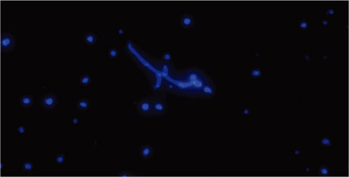 清晰、真菌(菌丝和孢子)在镜下为清晰的亮色