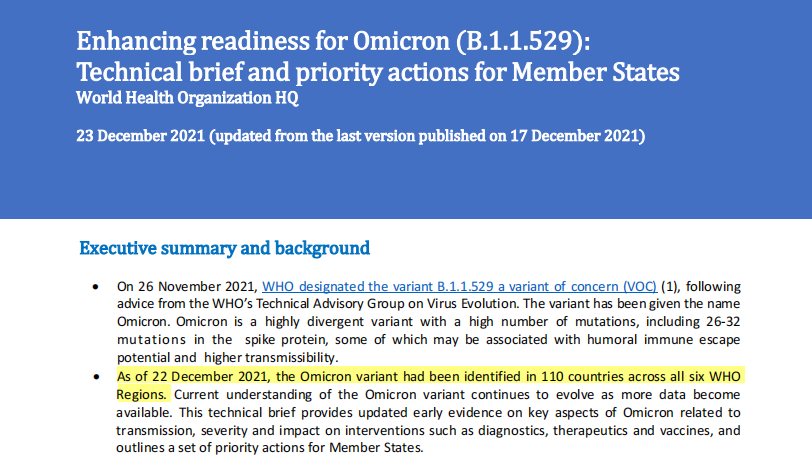 As of 22 December 2021, the Omicron variant had been identified in 110 countries across all six WHO Regions.