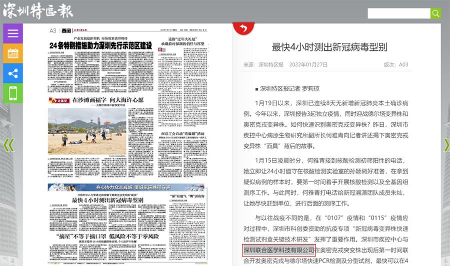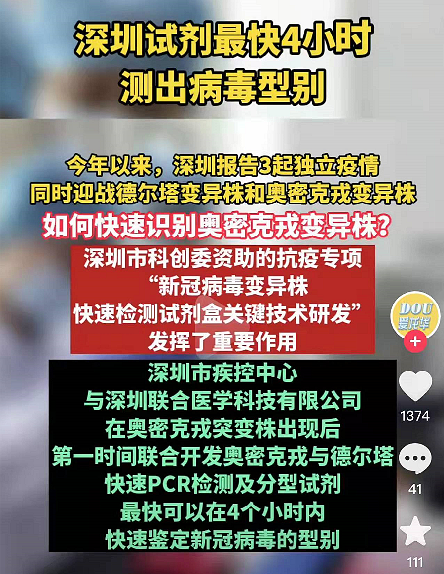 今年以来,深圳报告3起独立疫情,同时迎战德尔塔变异株和奥密克戎变异株。面对出现的新型变异株,在“0107”疫情、“0115”疫情的应对过程中,深圳市科创委资助的抗疫专项“新冠病毒变异株快速检测试剂盒关键技术研发”发挥了重要作用。该专项由深圳市疾控中心与深圳联合医学科技有限公司共同研发,在奥密克戎突变株出现后第一时间联合开发奥密克戎与德尔塔快速PCR检测及分型试剂,最快可以在4个小时内,快速鉴定新冠病毒的型别。