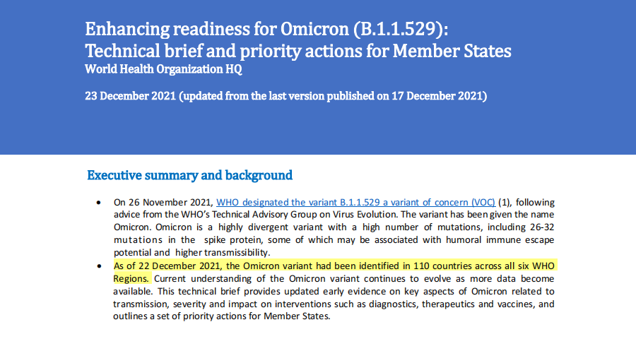 截止目前,据世界卫生组织简报指出,全球110个国家或地区已检出Omicron突变株(B.1.1.529,BA.1,BA.2,BA.3)。