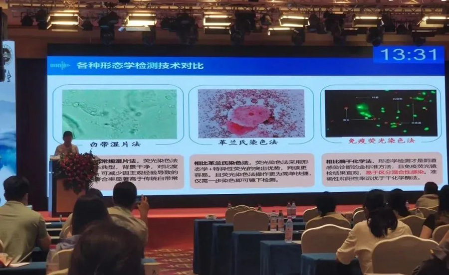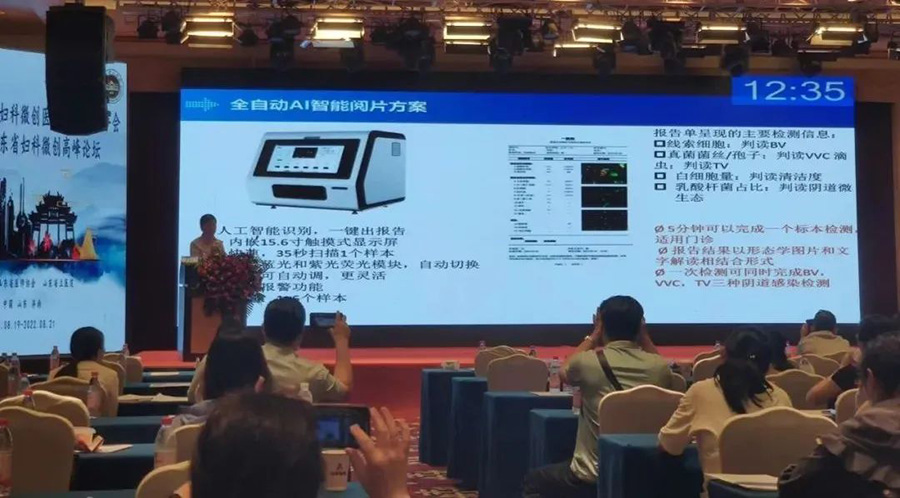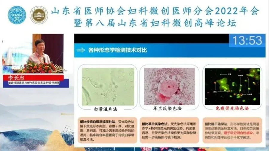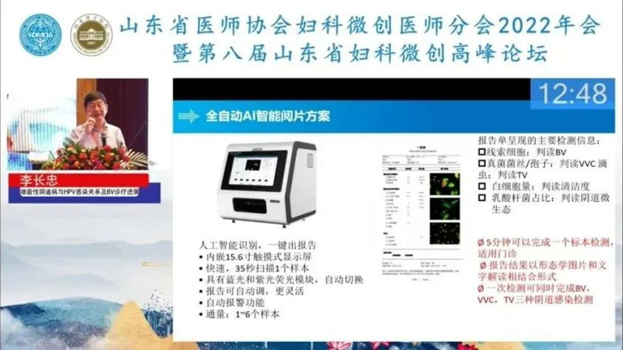 在谈到BV的诊断方法学时,李长忠教授对传统的白带湿片法、革兰氏染色法、多重免疫荧光染色技术,从辨识度、准确性、操作性等方面做了综合对比,对多重免疫荧光染色技术给予了高度赞赏,并对我司全自动AI智能阅片方案给予了高度的认可和评价,并称妇科阴道炎的检测也将向着智能化的方向快速发展。