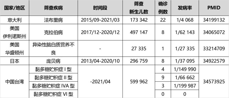 2021年见于文献报道的新生儿溶酶体贮积症筛查项目结果见下表。尽管这些研究表明大规模新生儿溶酶体贮积症筛查具有可行性,但其复杂性也不容忽视,包括如何识别晚发型个体或无法治疗个体、如何进一步解决因假性缺陷位点导致的假阳性比例过高的问题等。